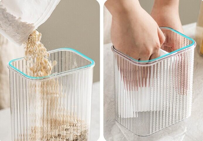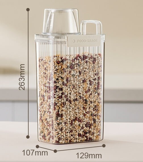この保存ケースは、お米や小麦粉、麺類の収納にぴったりです。軽量カップが付属しているので、計量もスムーズに行え、必要な時にサッと取り出せるのが魅力です!